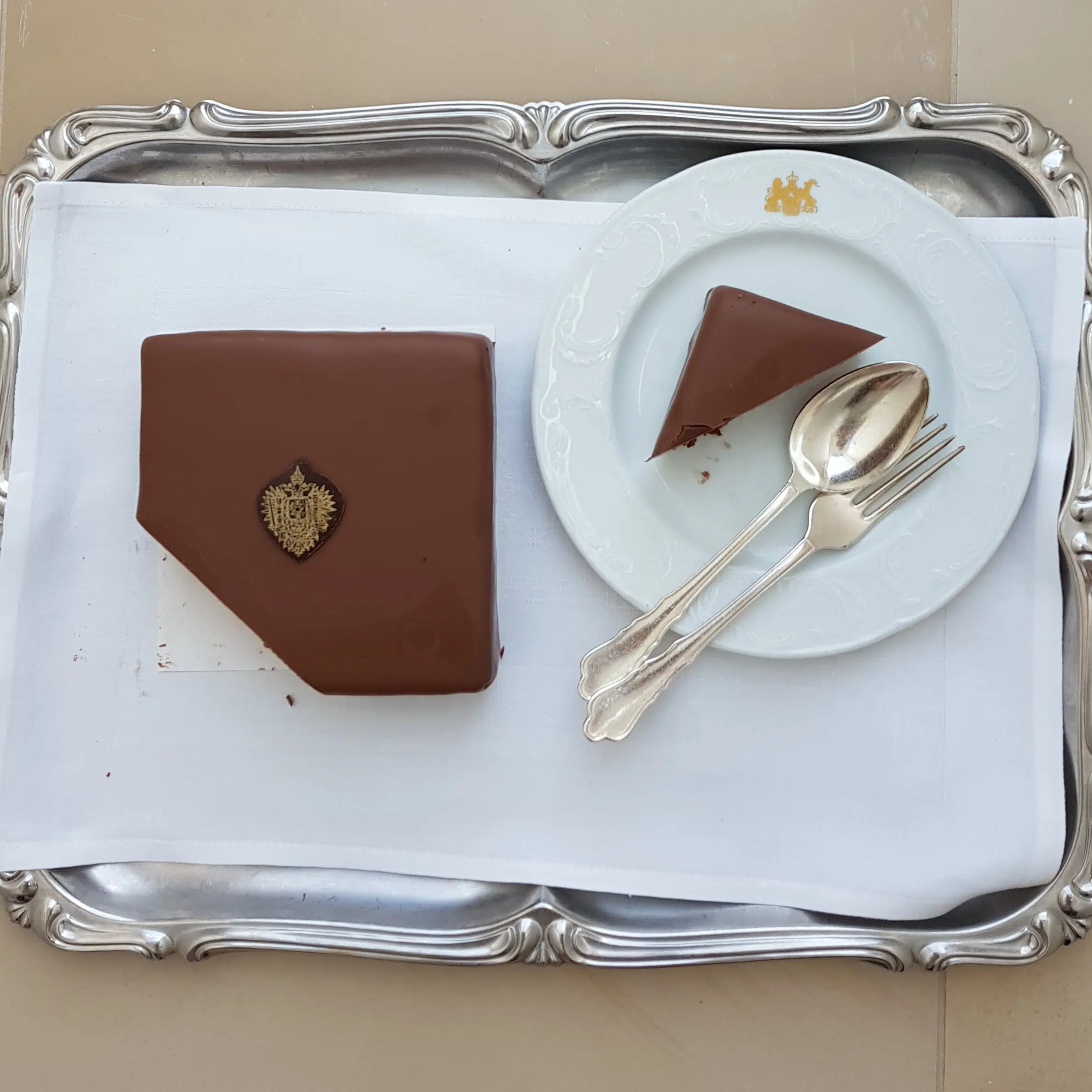 Najmniejsza porcja Sacher Torte – cena 5,10 EUR, kieliszek Gruner Veltliner 7,50 EUR