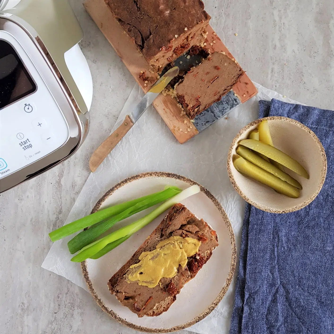 Pasztet z kaszą i pieczarkami dobrze smakuje z kiszonym ogórkiem, kaparami, musztardą i dobrym pieczywem.