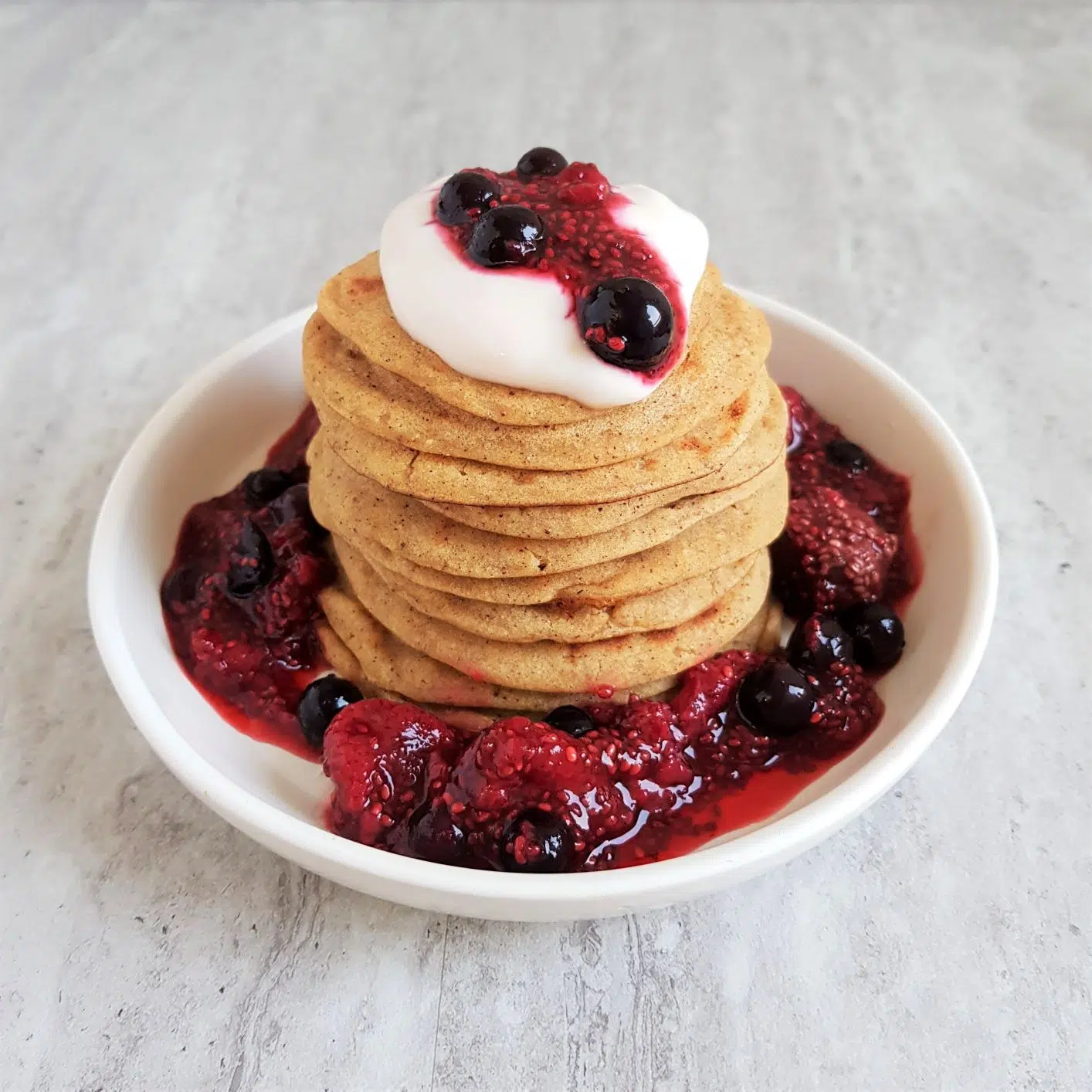 Samo ciasto nie jest słodkie (tu słodzikiem jest tylko jabłko) więc jeżeli macie ochotę na słodkie śniadanie to polejcie je np. syropem klonowym. Ja swoją porcję zjadłam z dżemem z chia i roślinnym jogurtem. Pycha.
