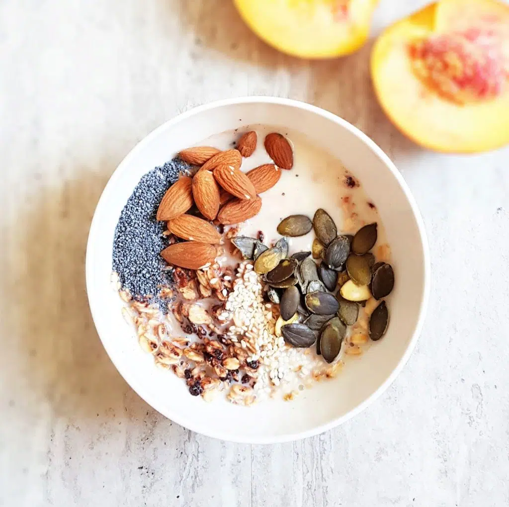 Potem pozostaje już tylko dorzucenie ulubionych owoców i nasion – polecam łyżeczkę sezamu.