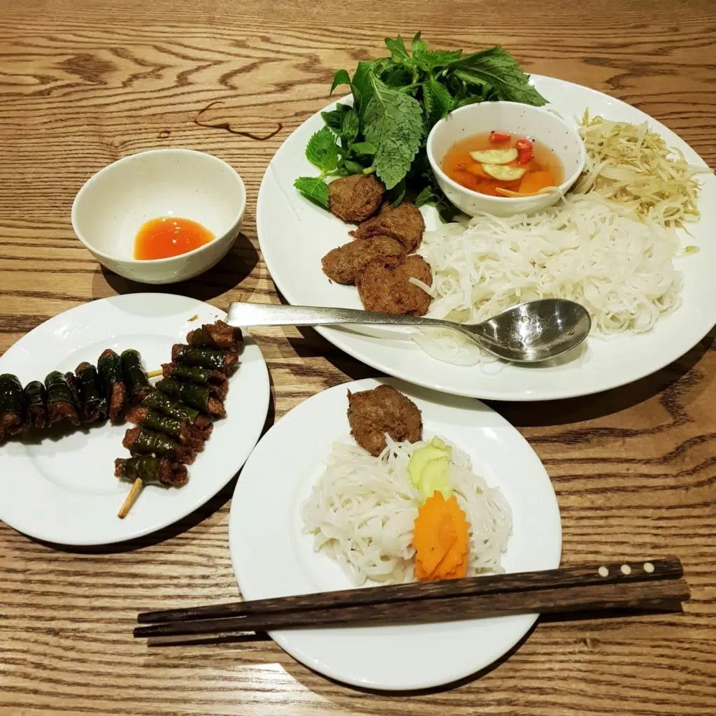W Minh Chay – Ma May popularne wietnamskie potrawy podawane są wersji wegańskiej. Wybrałam się tam już pierwszego wieczoru po przylocie do Hanoi. Zamówiłam bun cha minhchay z kotlecikami z seitana (w cenie 79 000 VND = ok 14,00 zł) a jako przystawkę xien nuong ga chay la chanh – wegańskie szaszłyki zawijane w liście limonki (36 000 VND = ok 6,00 zł). Zioła podawane do niemalże każdej potrawy dodają świeżości i pomagają w trawieniu. To był idealny początek pobytu w Hanoi.