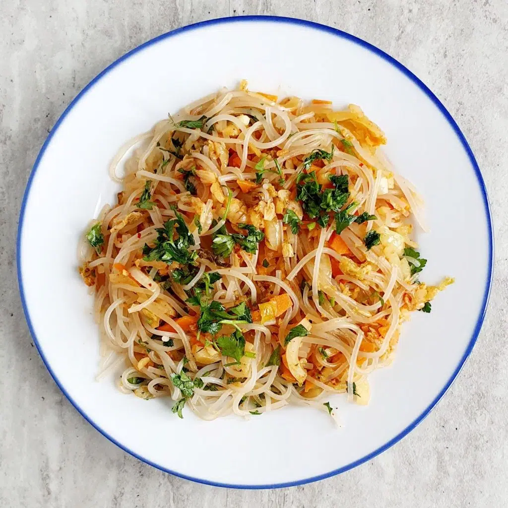 Rozsmakowałam się w makaronie ze słodkich ziemniaków. Po ugotowaniu jest sprężysty a po dodaniu do pozostałych składników nasiąka nimi. Doskonale pasuje do wyraźnego w smaku dania z kiszoną kapustą kimchi.