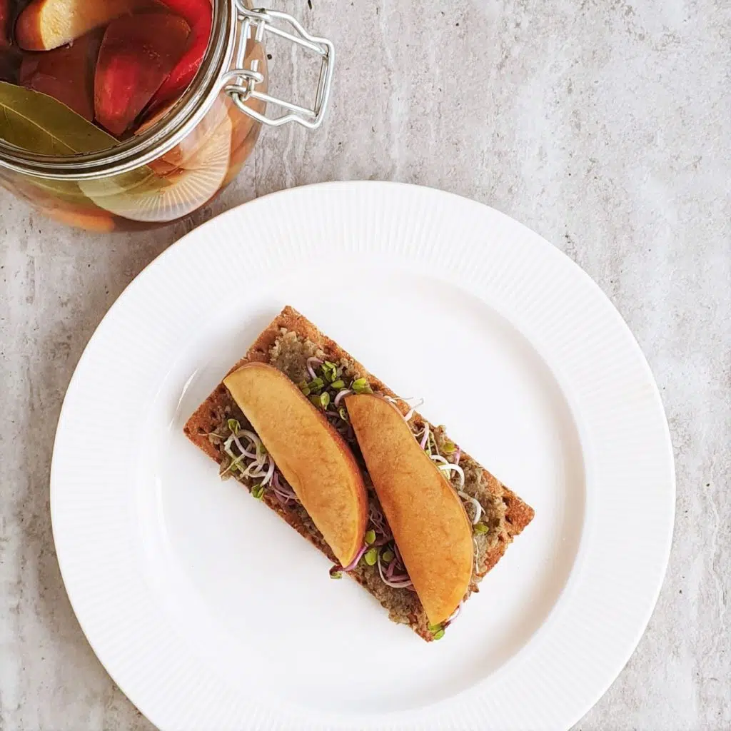 Oto kanapka z gryczanym smarowidłem, kiełkami i marynowanymi jabłkami. Dajcie znać w komentarzach na Facebook do czego jeszcze zjecie marynowane jabłka.