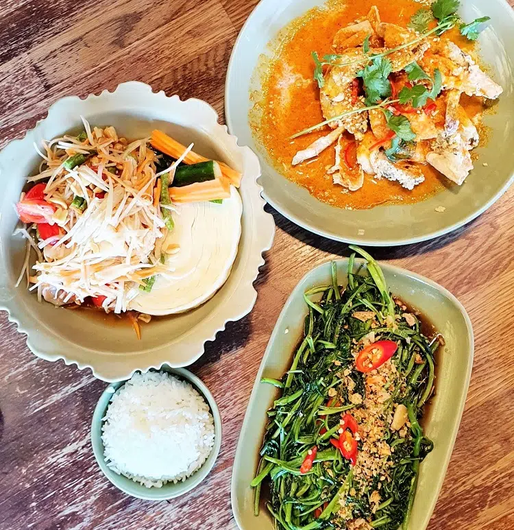 Przy pierwszej wizycie zamówiłam smażony szpinak wodny (Morning Glory) z czosnkiem i chili. Nie tak chrupiący jak w Bangkoku ale i tak by ło to miłe wspomnienie podróży do Azji. Z tego samego powodu skusiłam się na sałatkę z zielonej papai z krewetkami (Som Tam Kung), którą uwielbiam. Tu była idealna – słodko pikantna i chrupiąca. W sam raz na dodatek do innych dań. Jeżeli najdzie Was ochota na pikantne curry to polecam zamówić wielkie krewetki w czerwonym curry podawane z ryżem. Ostrość gwarantowana.