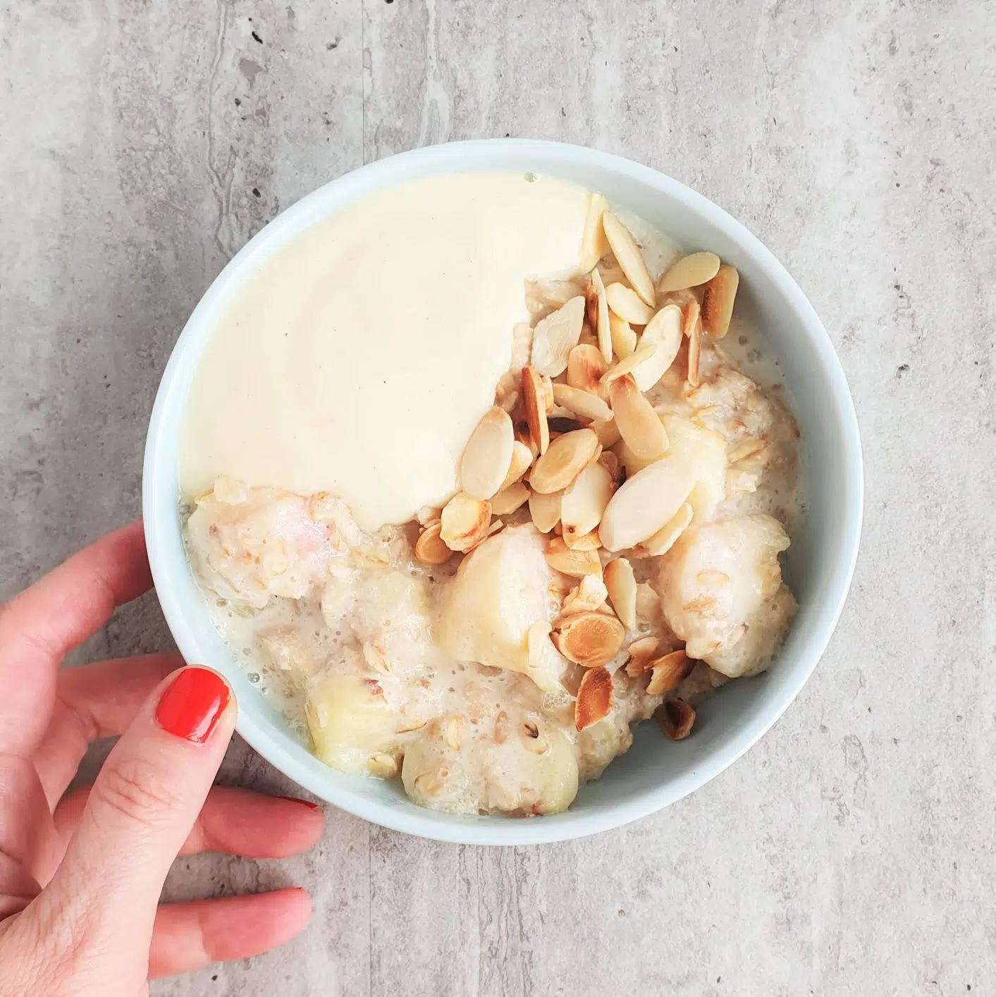 - około 150-200 ml mleka roślinnego lub wody. Ja dodałam mleka sojowego. Owsiane, ryżowe, migdałowe też będzie ok. Ponieważ do tej owsianki dodawany jest jogurt to można ją ugotować na wodzie