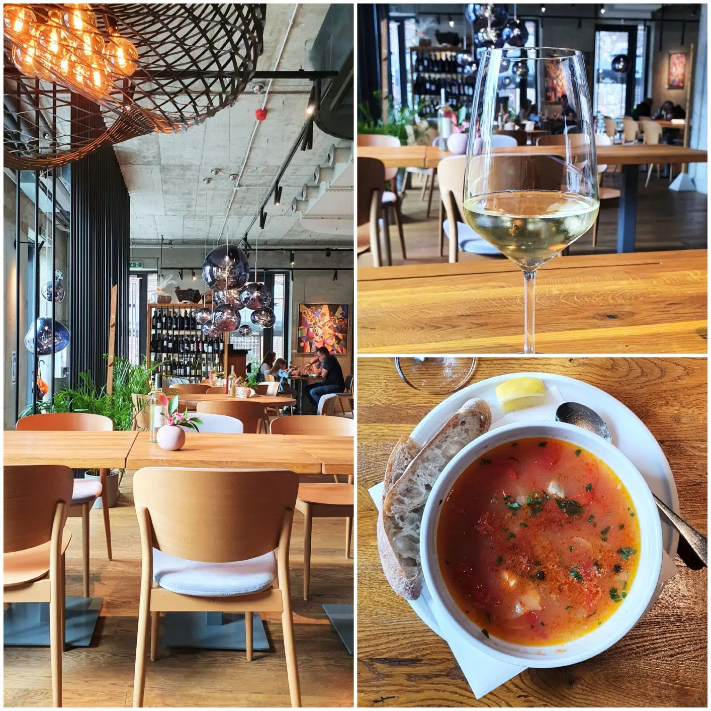 Len i Bawełna to restauracja – siostra Bawełny z łódzkiej Manufaktury. Duży lokal o prostym ale przytulnym wystroju znajdziecie na terenie OFF Piotrkowska. Karta dań jest obszerna i zaczyna się od śniadań, które zjecie tu codziennie od 9:30 do 12:00. To co mnie zaciekawiło w tym miejscu, to możliwość zamówienia niektórych win w porcjach degustacyjnych. Karta nie jest długa ale ma kilka ciekawych pozycji np. wina polskie. Przy okazji do wina zamówiłam przyjemną w smaku zupę rybną (26,00 zł).