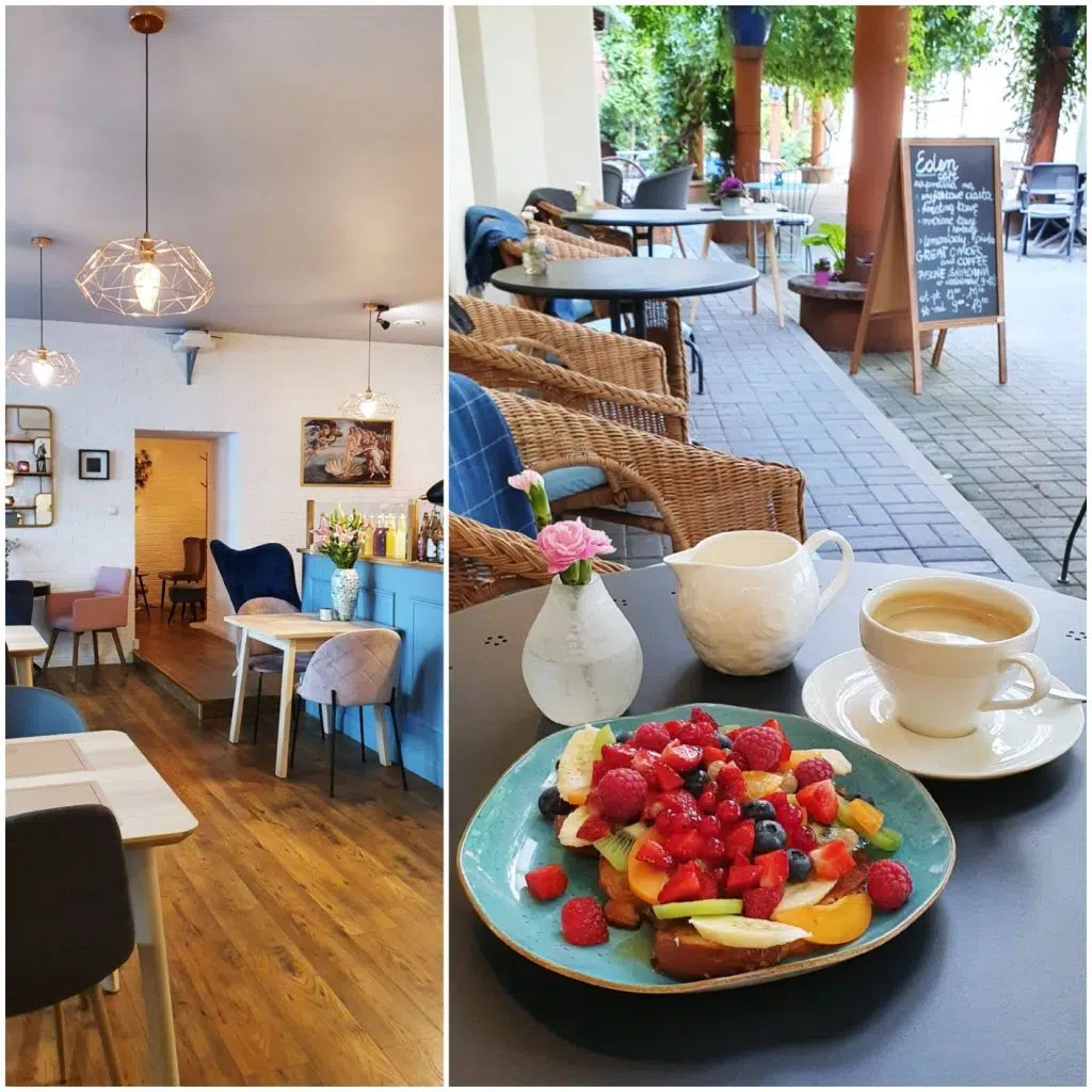 W soboty i niedzielne można tu zjeść śniadanie już od 9:00 rano. W krótkiej śniadaniowej karcie znajdziecie kilka zestawów. Ja skusiłam się grzanki z chałki z syropem klonowym i owocami (17,00 zł). Zrezygnowałam z kremu diplomat oraz twarożku podawanych zamiennie (nabiału unikam). Porcja była zacnych rozmiarów a owoce przepysznie różnorodne. Do nich kawa z sojowym mlekiem, stolik w cudownym, zacisznym ogródku i poranek można uznać za bardzo udany.