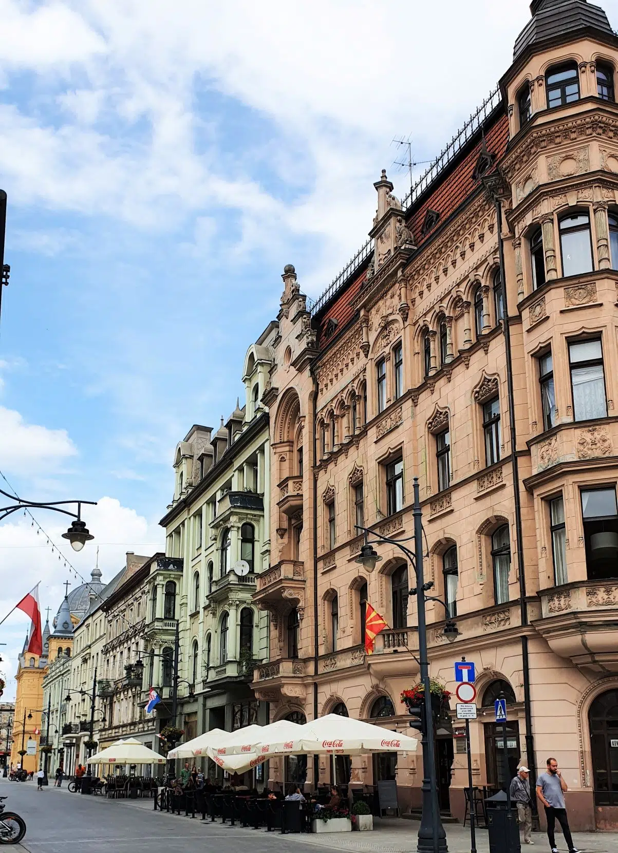 To jedna z najdłuższych handlowych ulic w Europie. Mierzy 4,2 km i ciągnie się od P. Wolności do Pl. Niepodległości. To wzdłuż niej ulokowane są przepięknie zdobione kamienice i liczne restauracje. Do dzisiaj jest wizytówką miasta. Niestety pandemia Covid nie ominęła Łodzi a liczne, powtarzające się od pierwszej połowy 2020 ograniczenia doprowadziły do zamknięcia wielu lokali przy Piotrkowskiej. Na szczęście ulica dalej funkcjonuje i popołudniami zapełnia się tłumami.