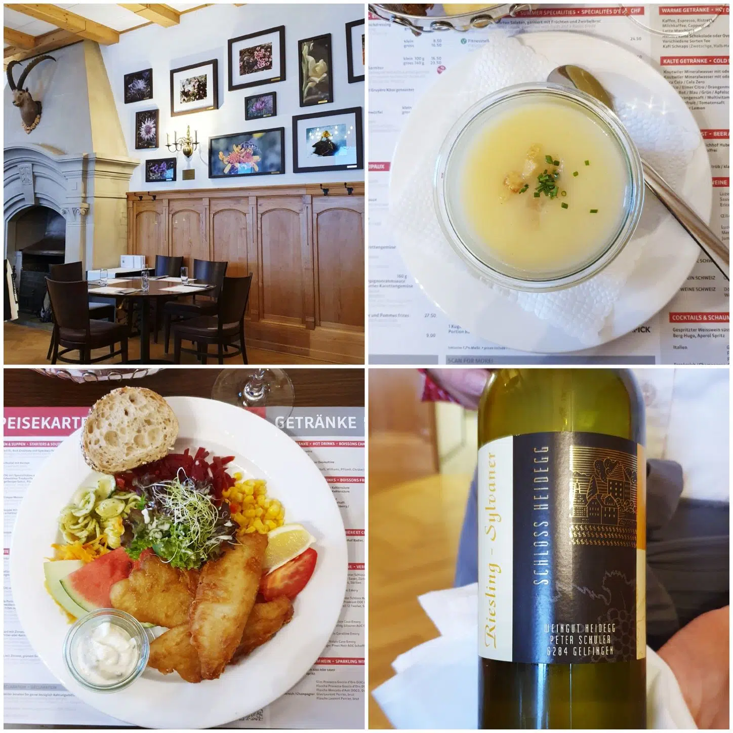 Na górze korzystałyśmy z zaproszenia Sarki – przedstawicielki Pilatus i zjadłyśmy smaczny lunch. Z karty wybrałam regionalną zupę ziemniaczaną z gruszką. Nie spodziewałam się, że takie połączenie będzie tak dobrze smakować. Na drugie danie prosta i zawsze smaczna opcja – smażona ryba i surówka. A jako dopełnienie – orzeźwiające, lokalne białe wino.