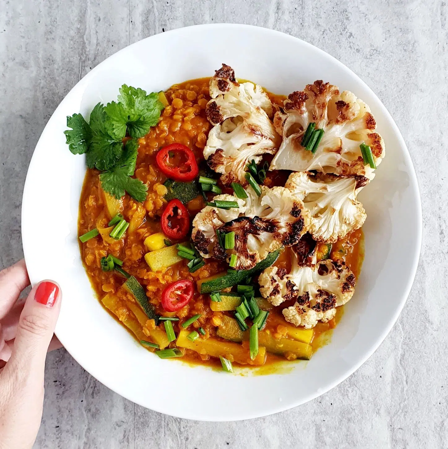 Dal z soczewicy nakładajcie na głębokie talerze lub do miseczek. Połóżcie na nim pieczonego kalafiora i posypcie wszystko szczypiorkiem lub/i kolendrą.