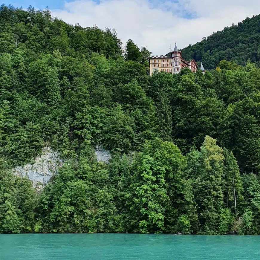 W miejscowości Brienz przesiadłyśmy się na statek płynący w kierunku Interlaken wzdłuż jeziora o nazwie Brienz. Chłodny i silny wiatr nie wygonił nas pod pokład. Widoki były zbyt zachwycające aby oglądać je przez szybę. Niestety zdjęcia nie oddają rzeczywistych kolorów mijanych zielonych stoków górskich i bajecznie turkusowej wody jeziora. Podróż trwała około 75 minut. Polecam wybrać statek zamiast pociągu chyba, że zależy Wam na czasie. Pociąg tą samą trasę do stacji Interlaken Ost pokona w około 20 minut.
