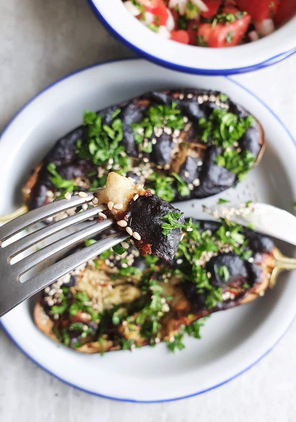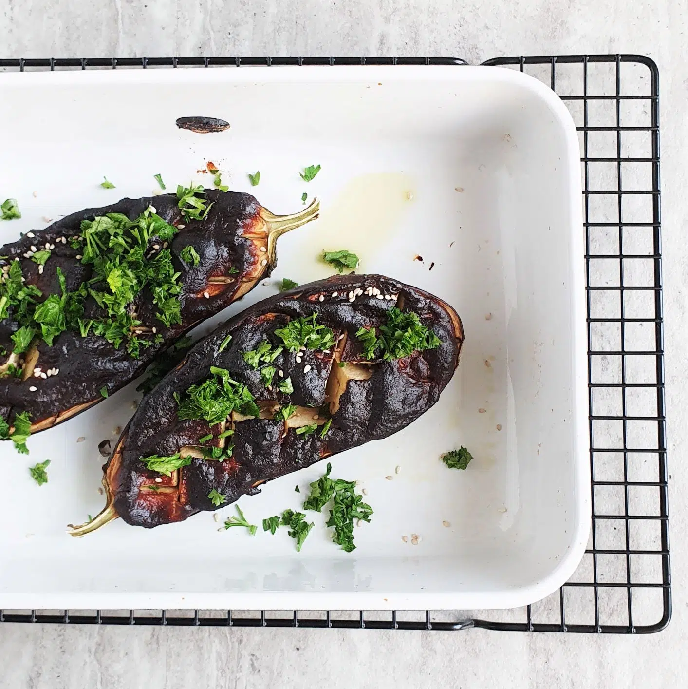 Po upieczeniu posypcie bakłażana posiekaną natką pietruszki oraz nasionami sezamu. Na koniec pozostaje Wam delektować się tym prostym, obłędnie smacznym posiłkiem.