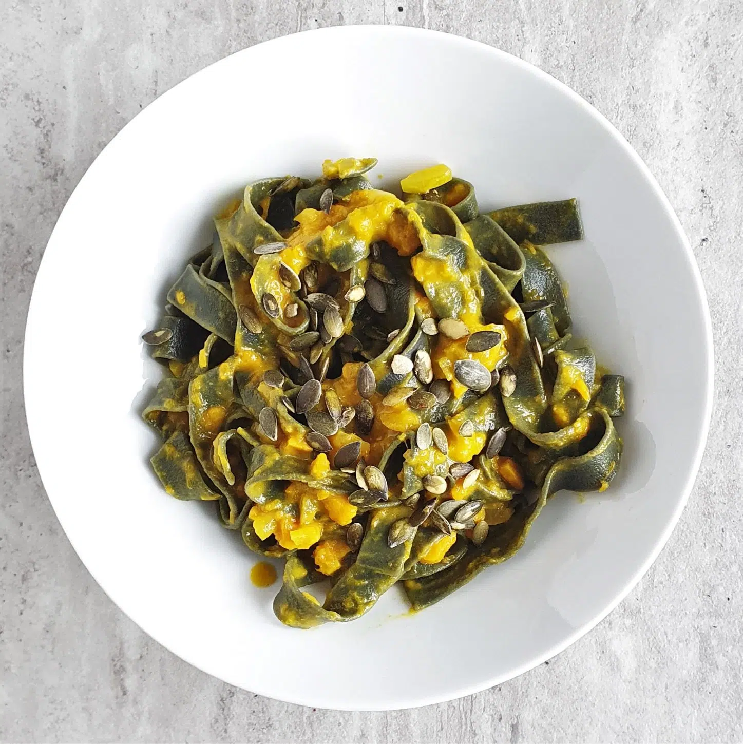 Wymieszajcie makaron z gęstym, dyniowym sosem. Nie zapomnijcie posypać danie pestkami dyni. Przyjemnie będą chrupać podczas jedzenia.