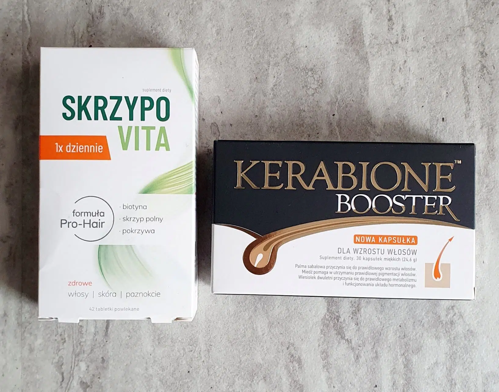 - suplementy na włosy – polecony przez Panią trycholog Kerabione Booster z palmą sabałową oraz mój dodatkowy pomysł czyli Skrzypovitę, ponieważ jej składniki pokrywają się z Kerabione tylko w witaminie A a Skrzypovita zawiera cenne dla włosów i paznokci cynk, biotynę, wyciąg ze skrzypu polnego oraz pokrzywy oraz kilka innych witamin. Przy okazji paznokcie mniej mi się łamią