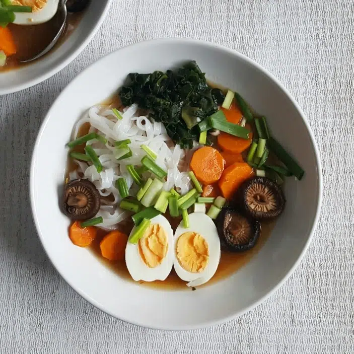 Zacznę od tej słynnej i bardzo zdrowej japońskiej zupy a raczej od mojej autorskiej wersji. Dodaję do niej nie tylko tofu i wakame ale również warzywa, które gotowały się w grzybowym bulionie a także grzyby shiitake. Taka miso-shiru (bardziej podobna już do miso ramen) smakuje mi najbardziej. Pełna smacznych dodatków, pożywna. Oczywiście jeżeli nie jadacie jajek to spokojnie możecie je pominąć.